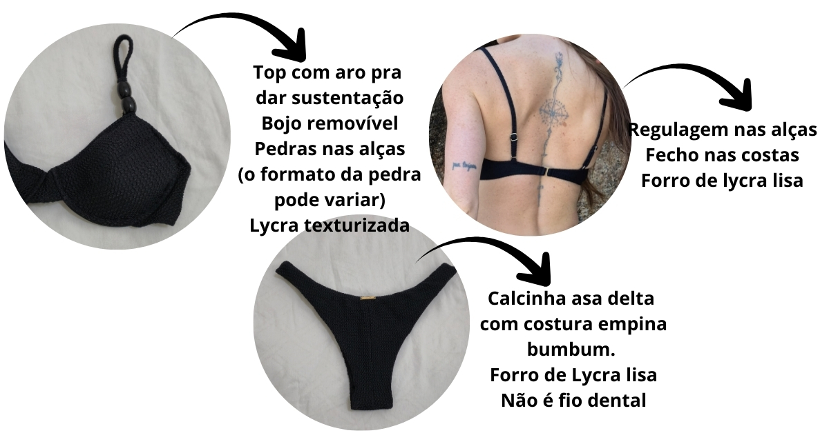 • Biquíni Meia Taça Preto com calcinha asa delta é uma peça ideal para quem busca sustentação, conforto e elegância. Confeccionado com lycra texturizada de excelente qualidade com bastante elastano para não apertar, secagem rápida. Pedras de resina nas alças que traz sofisticação para peça. (O FORMATO DA PEDRA PODE VARIAR DE ACORDO COM A DISPONIBILIDADE)