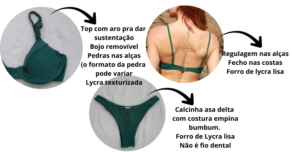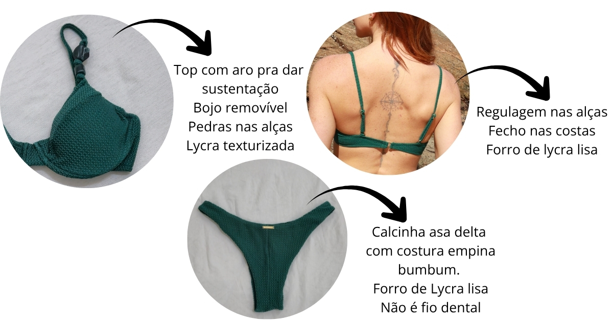 • Biquíni Meia Taça Verde Esmeralda com calcinha asa delta é uma peça ideal para quem busca sustentação, conforto e elegância. Confeccionado com lycra texturizada de excelente qualidade com bastante elastano para não apertar, secagem rápida. Pedras de resina nas alças que traz sofisticação para peça. (O FORMATO DA PEDRA PODE VARIAR DE ACORDO COM A DISPONIBILIDADE)